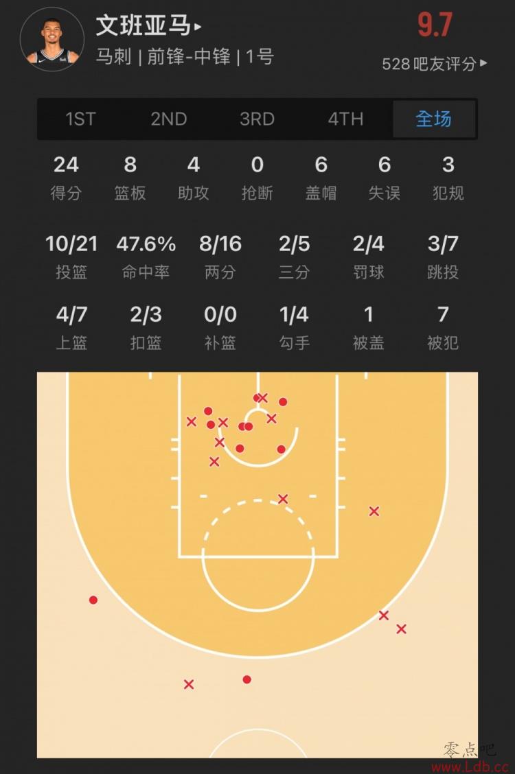 马刺状元秀 维克托-文班亚马 出战27.8分钟