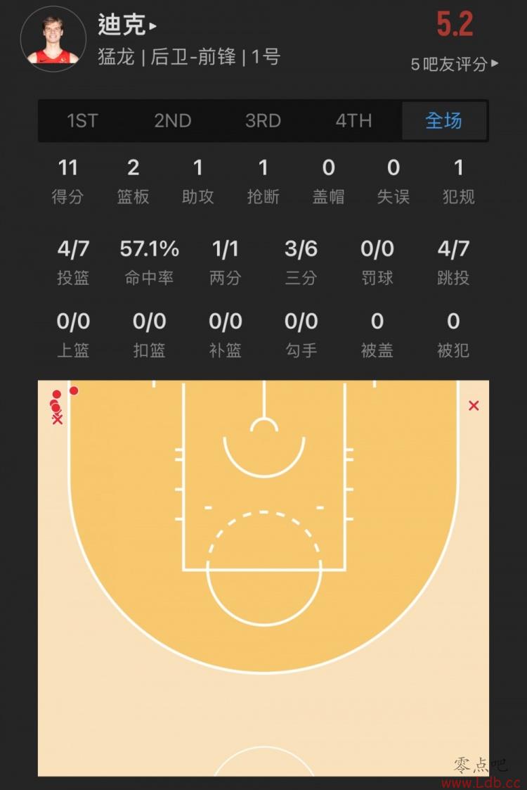 猛龙13号秀 格雷迪-迪克 出战16.2分钟