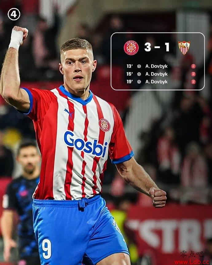 赫罗纳5:1将塞维利亚斩于马下,27岁的乌克兰中锋多夫比克打大演帽子戏法,3个进球发生在第13到第19分钟这6分钟内。