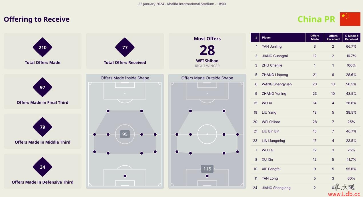 根据亚洲杯官方数据,本场国足主动接应次数77次,卡塔尔有123次。其中国足阵中主动接应次数最高的球员是韦世豪(28次)。