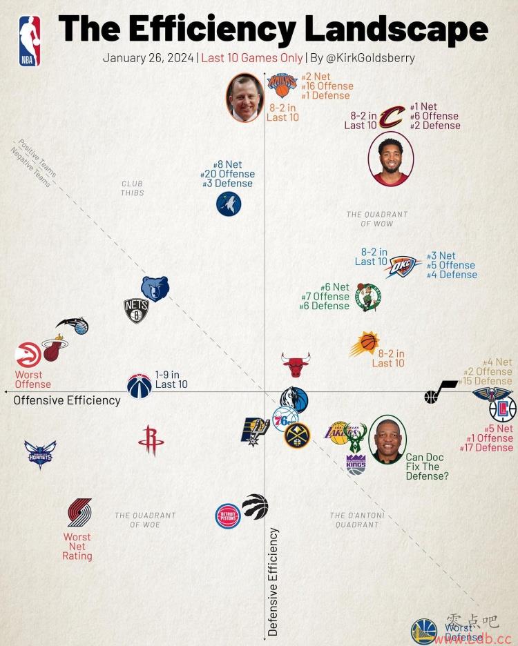 近10场攻防效率图:??勇士防守断档垫底 快船进攻仍最强