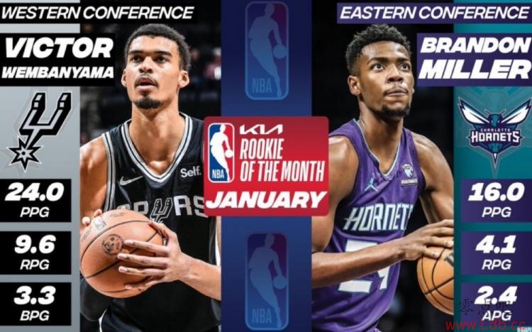 NBA官方今日公布了1月最佳新秀得主,马刺新星文班亚马、黄蜂新星布兰登-米勒分别当选