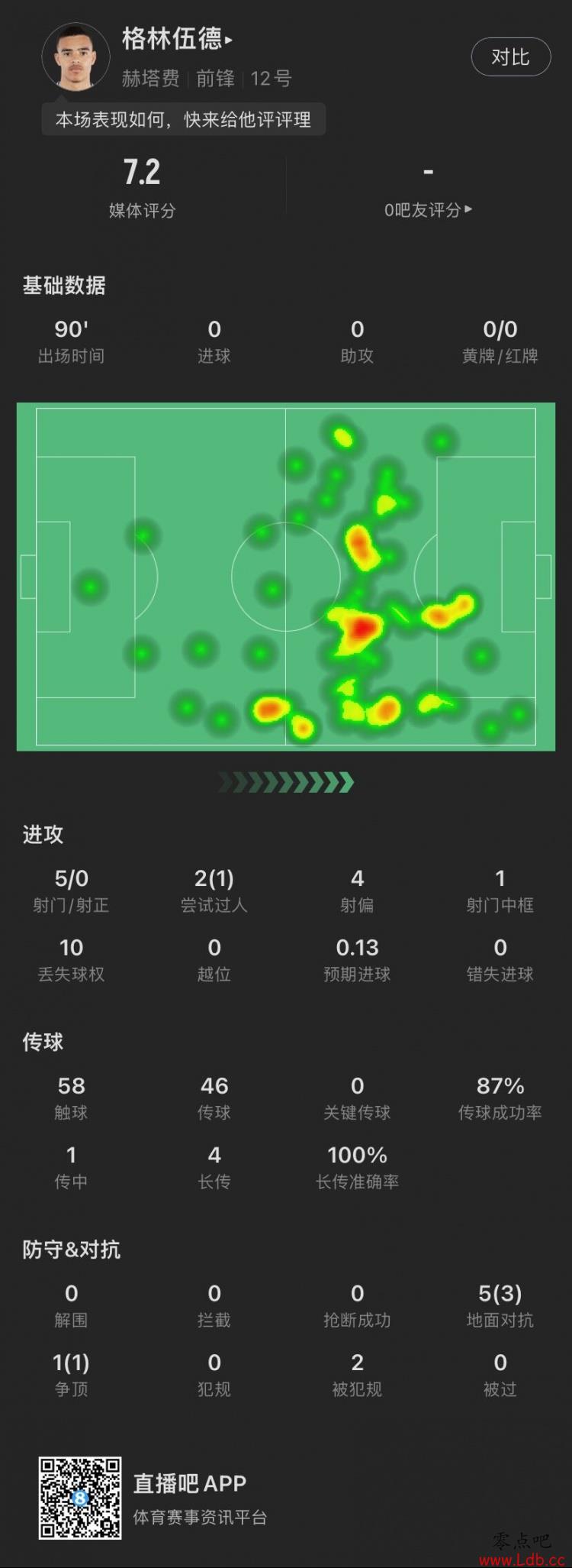 格林伍德本场数据:5次射门0射正,4次长传全部成功,评分7.2