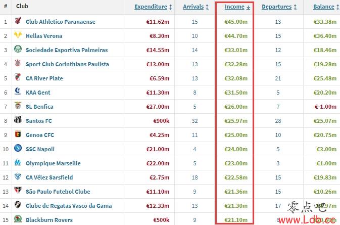 球队冬窗卖人收入前15:巴拉纳竞技第一,仅有4支五大联赛球队