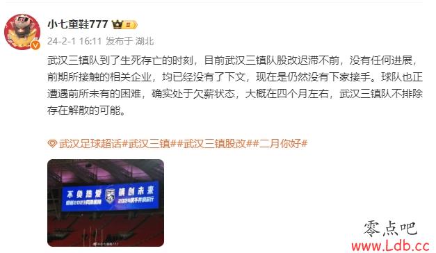 零点吧足球02月02日讯 博主“小七童鞋777”消息,武汉三镇不排除存在解散的可能。