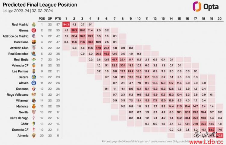 根据Opta的预测,皇马获得本赛季西甲冠军的概率为94.3%,赫罗纳夺冠概率4.1%,马竞夺冠概率1.1%,巴萨夺冠概率仅为0.4%。