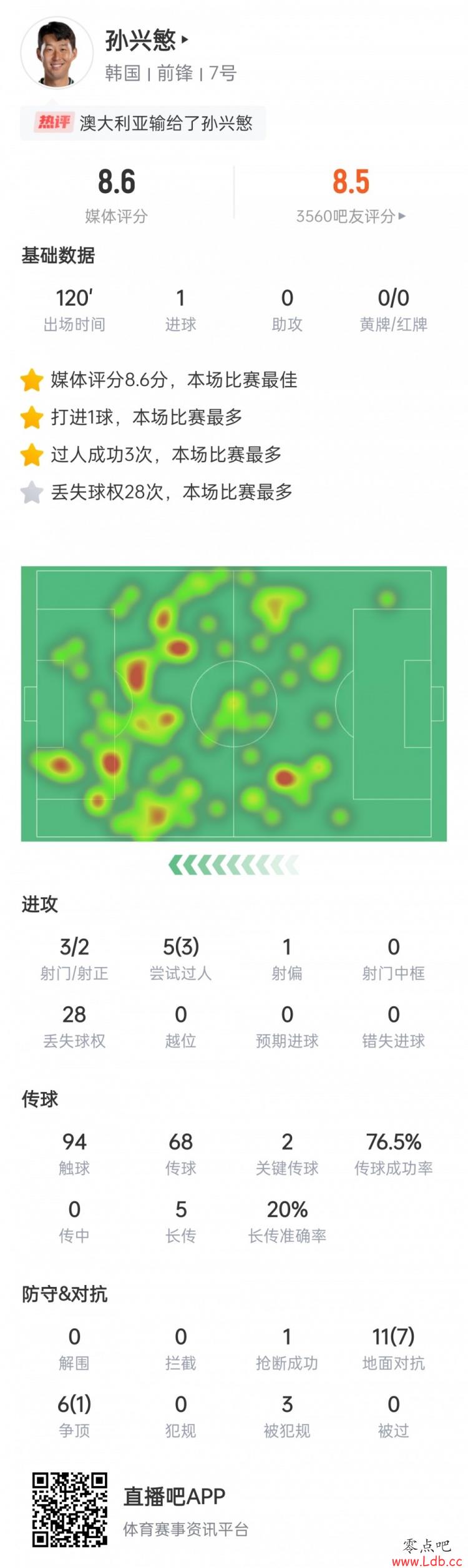 零点吧足球2月3日讯 亚洲杯1/4决赛,韩国队2-1惊险逆转澳大利亚队晋级半决赛。孙兴慜打满全场,他制造了绝平点球,并在加时赛轰入反超比分的任意球世界波。以下为孙兴慜本场数据和评分。