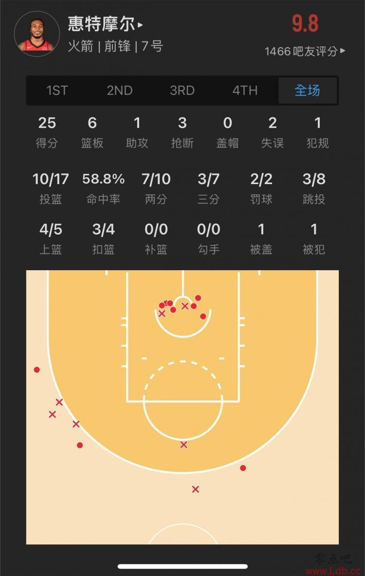 火箭20号秀 卡姆-惠特摩尔 出战21.4分钟