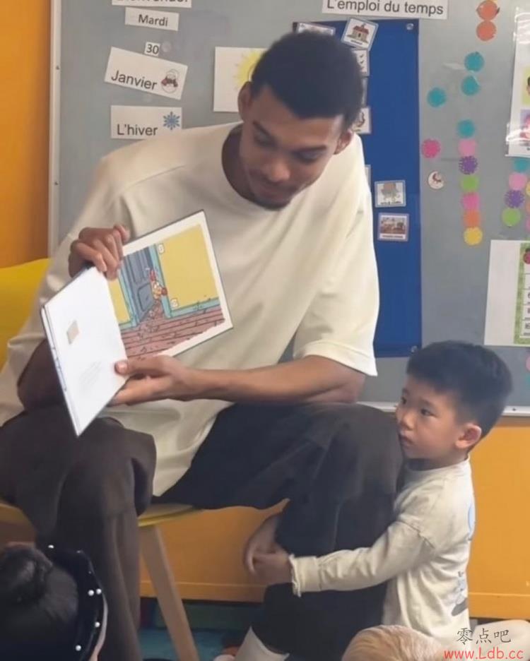 这体型差!文班现身学校为小朋友朗读书籍 小男孩紧抱其小腿