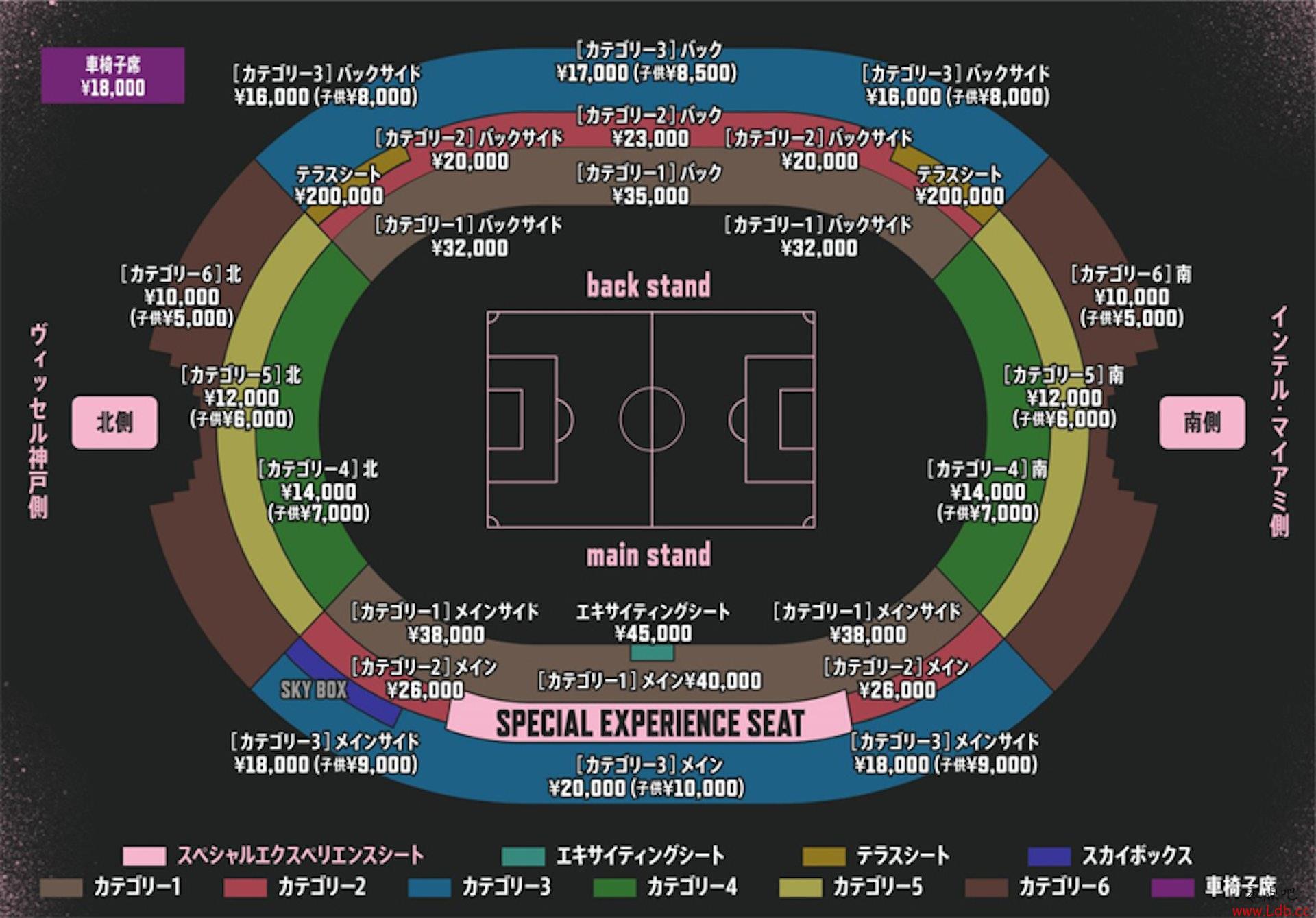 今次梅西、贝克汉姆率迈阿密国际到访日本,神户胜利船也隆重其事,在比赛场地国立竞技场划出多种票价,若只计算纯比赛门票,撇除厢房票,在正中央最前、球队列队时面对的看台门票价钱最高,达45000日元,比中国香港站大球场三楼中间的票价更低,也不及中国香港站最贵门票的一半。