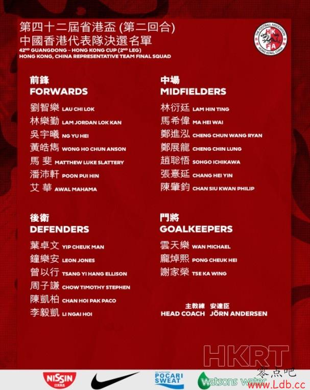 附中国香港队省港杯第二回合名单: