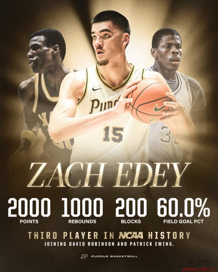 据统计,扎克-埃迪成为NCAA历史上第三位拿下至少2000分1000篮板200盖帽、且命中率至少60%的球员。