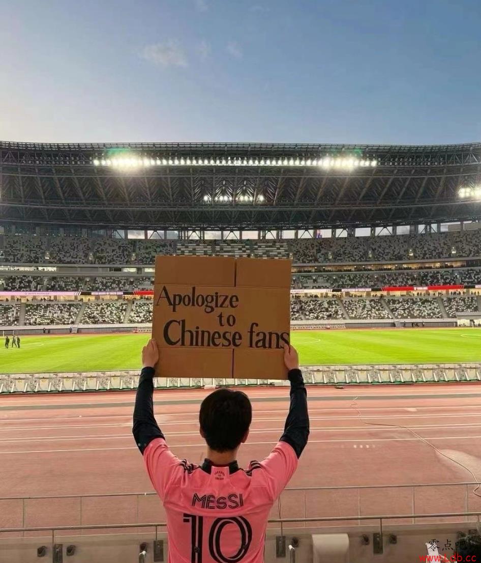 身穿梅西球衣的球迷举牌:向中国球迷道歉