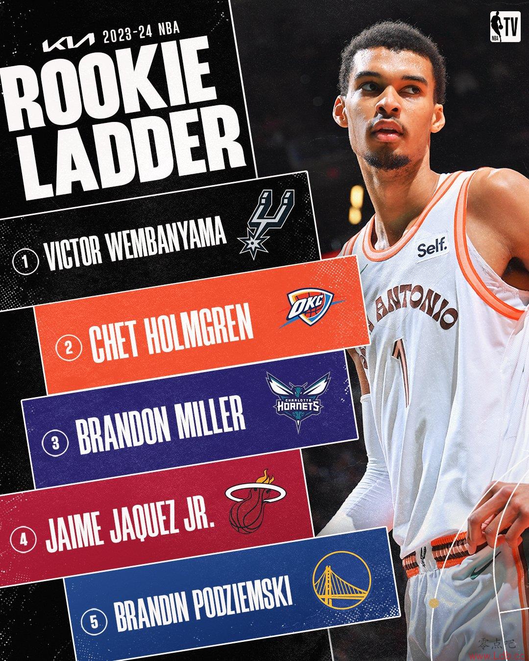 NBA官网公布了最新一期的新秀榜,文班亚马继续位居榜首,霍姆格伦和布兰登-米勒分列二三位,波杰姆斯基排名第五,惠特摩尔在第七