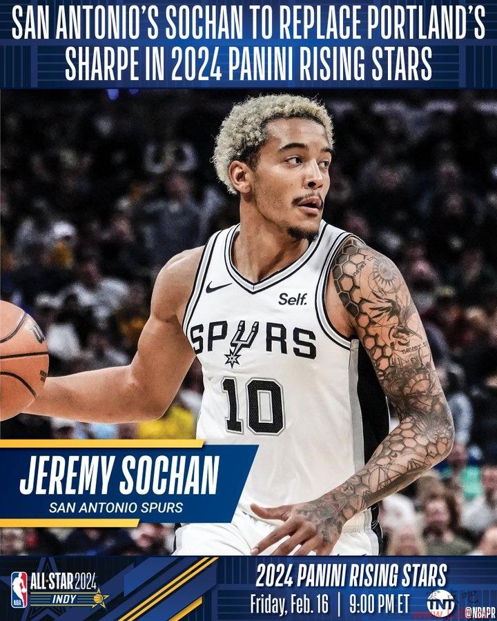 零点吧2月9日讯 今天,NBA官方公布,马刺球员索汉将顶替受伤的开拓者球员谢顿-夏普,参加今年的全明星新秀赛。