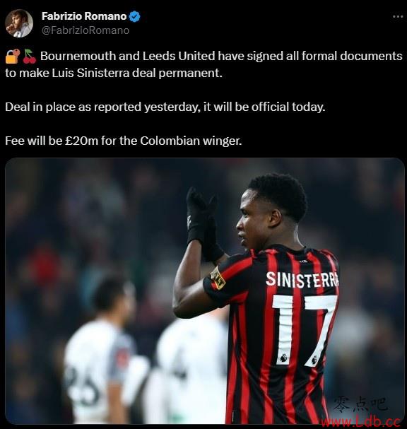罗马诺表示,伯恩茅斯已经和利兹联谈妥了买断球员的交易,所有正式文件也已经签署,费用2000万英镑,今日官宣。