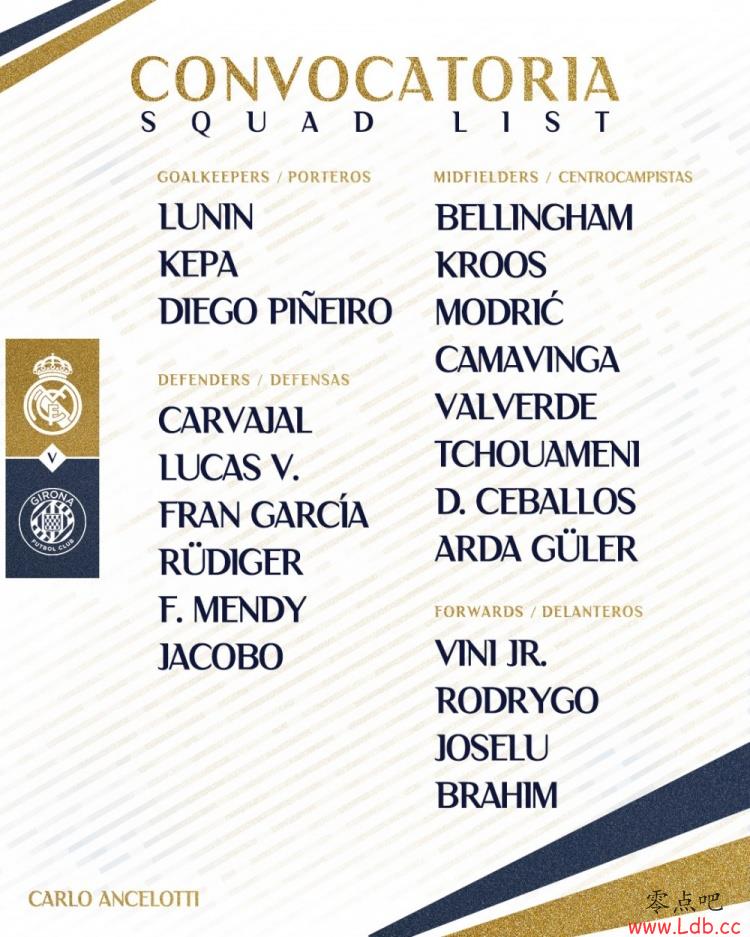 零点吧足球2月9日讯 北京时间2月11日凌晨,皇马将在西甲第24轮比赛中主场对阵赫罗纳,皇马公布了此役的球员名单,贝林厄姆、维尼修斯、吕迪格在列,纳乔因肌肉超负荷缺席。