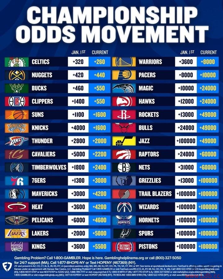 截止日后夺冠赔率:绿军+260居首 尼克斯大幅提高 湖勇大幅降低
