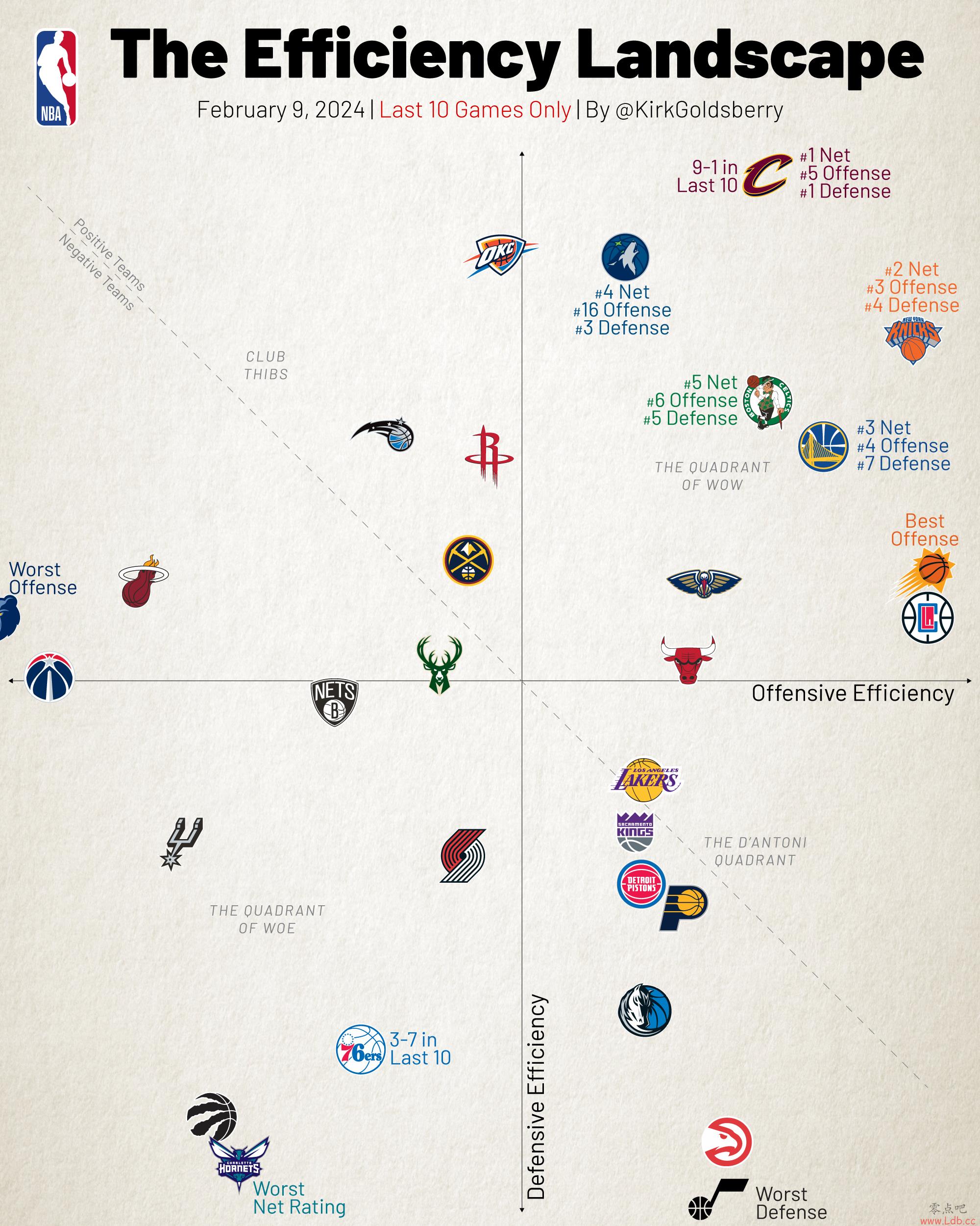 零点吧02月10日讯 数据专家Kirk Goldsberry更新了过去10场比赛联盟各队的攻防效率图,横轴代表进攻效率,越靠右越好,众轴代表防守效率,越靠上越强。