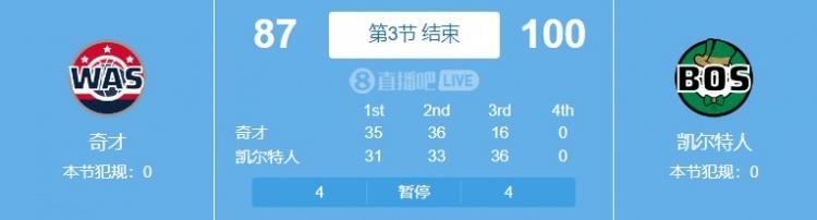 第三节,凯尔特人22中13,而奇才只有22中7,快攻得分7-2,内线得分18-10。