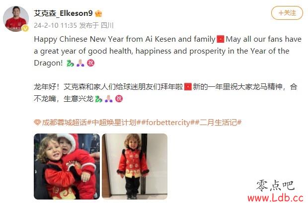 零点吧足球2月10日讯 今天是农历大年初一,成都蓉城前锋、归化国脚艾克森今日更新社媒,向球迷拜年。