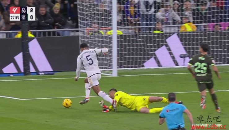 比赛第35分钟,贝林厄姆前插得球,过掉门将后推射得手,皇马2-0领先!