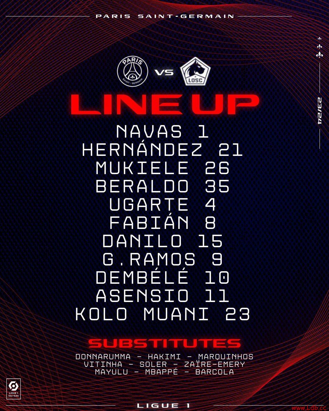 巴黎首发:1-纳瓦斯、4-乌加特、21-卢卡斯-埃尔南德斯、26-穆基勒、35-贝拉尔多、8-法比安-鲁伊斯、15-达尼洛-佩雷拉、9-贡萨洛-拉莫斯、10-登贝莱、11-阿森西奥、23-穆阿尼