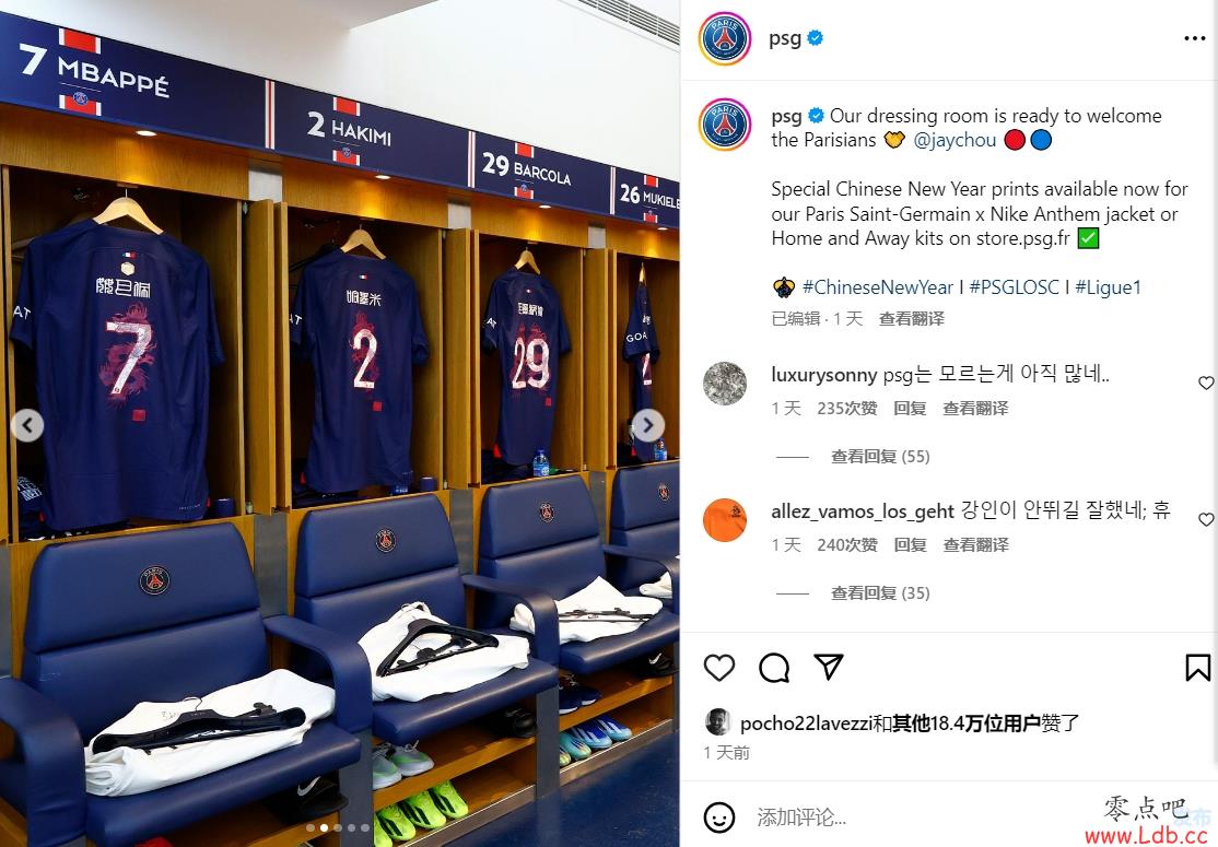 零点吧足球02月12日讯 在龙年新春之际,巴黎圣日耳曼与巨星周杰伦合作打造龙年独家设计球衣。在与里尔比赛前,巴黎社媒晒出更衣室的中文球衣,但评论区的韩国球迷却破防表示并不应该称做Chinese New Year。