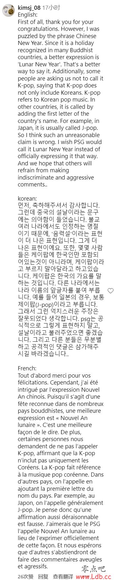 韩国球迷三语:首先,感谢你们的祝贺。不过,我对 "中国新年(Chinese New Year)"一词感到困惑。因为这是许多佛教国家承认的节日,所以更好的说法是 "农历新年(Lunar New Year)",这样说比较好。此外,有些人要求我们不要称之为K-pop,说 K-pop不仅包括韩国人,K-pop 指的是韩国流行音乐。在其他国家,它的叫法是加上国家名称的第一个字母。例如在日本它通常被称为 J-pop。因此,我认为这种不合理的说法是错误的。我希望巴黎将其称为农历新年,而不是官方的那种表达,也希望其他人不要不分青红皂白地发表过激言论。