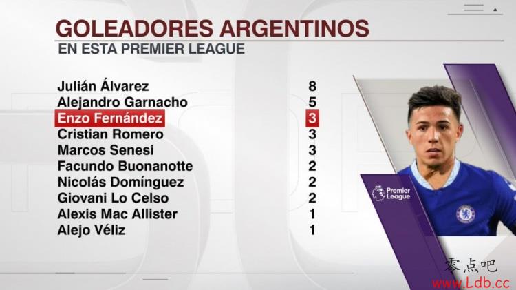 零点吧足球2月13日讯 在英超第24轮比赛中,恩佐-费尔南德斯补时阶段破门,帮助切尔西3-1击败水晶宫,恩佐本赛季已经在英超打进3球,阿根廷球员中并列第三多。
