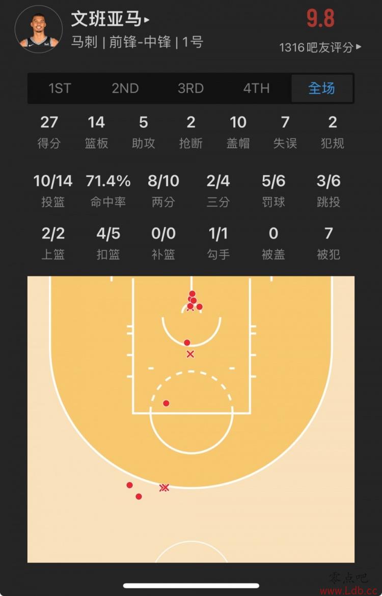 马刺状元秀 维克托-文班亚马 出战29.0分钟