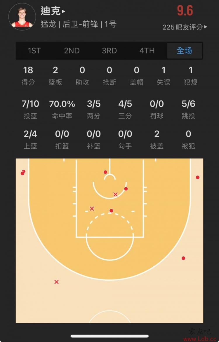 猛龙13号秀 格雷迪-迪克 出战21.8分钟