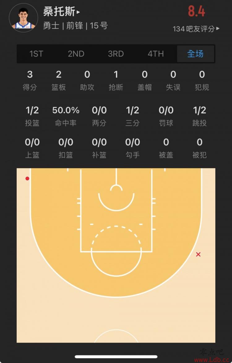 勇士上届55号秀 盖-桑托斯 出战2.3分钟