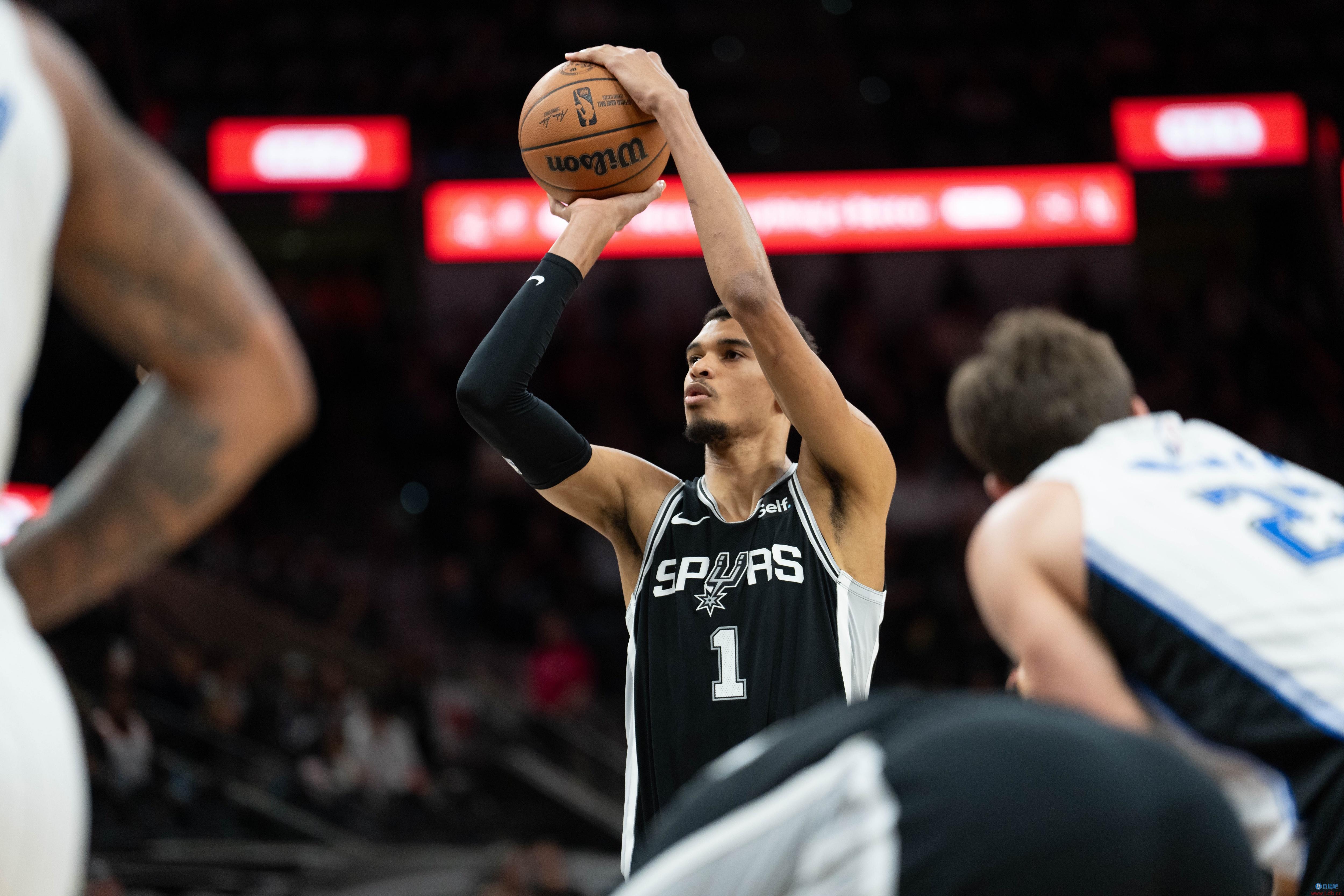 目前比赛首节刚刚过半,马刺状元文班亚马8中4,三分球4中2,罚球3中2,拿到12分2篮板2助攻2盖帽的数据,正负值+10。