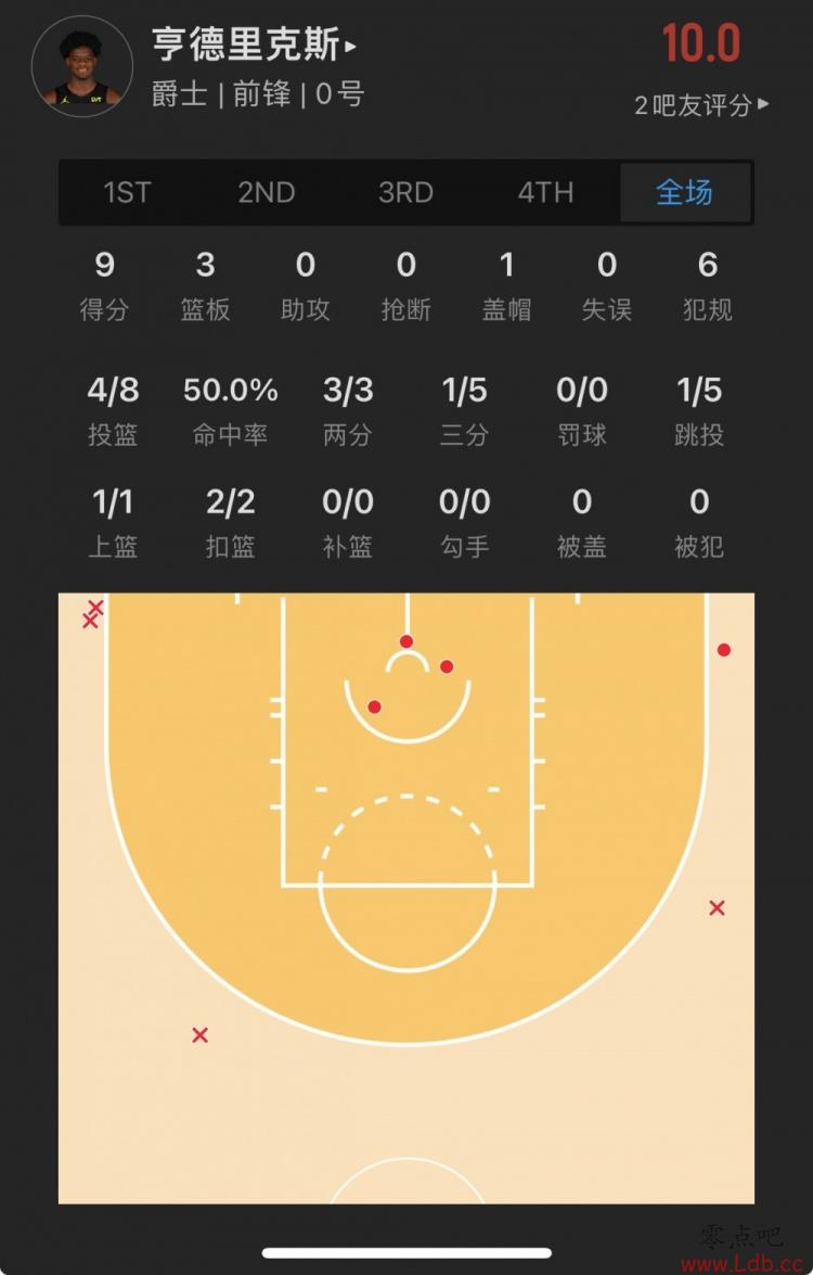 爵士9号秀 泰勒-亨德里克斯 出战25.8分钟