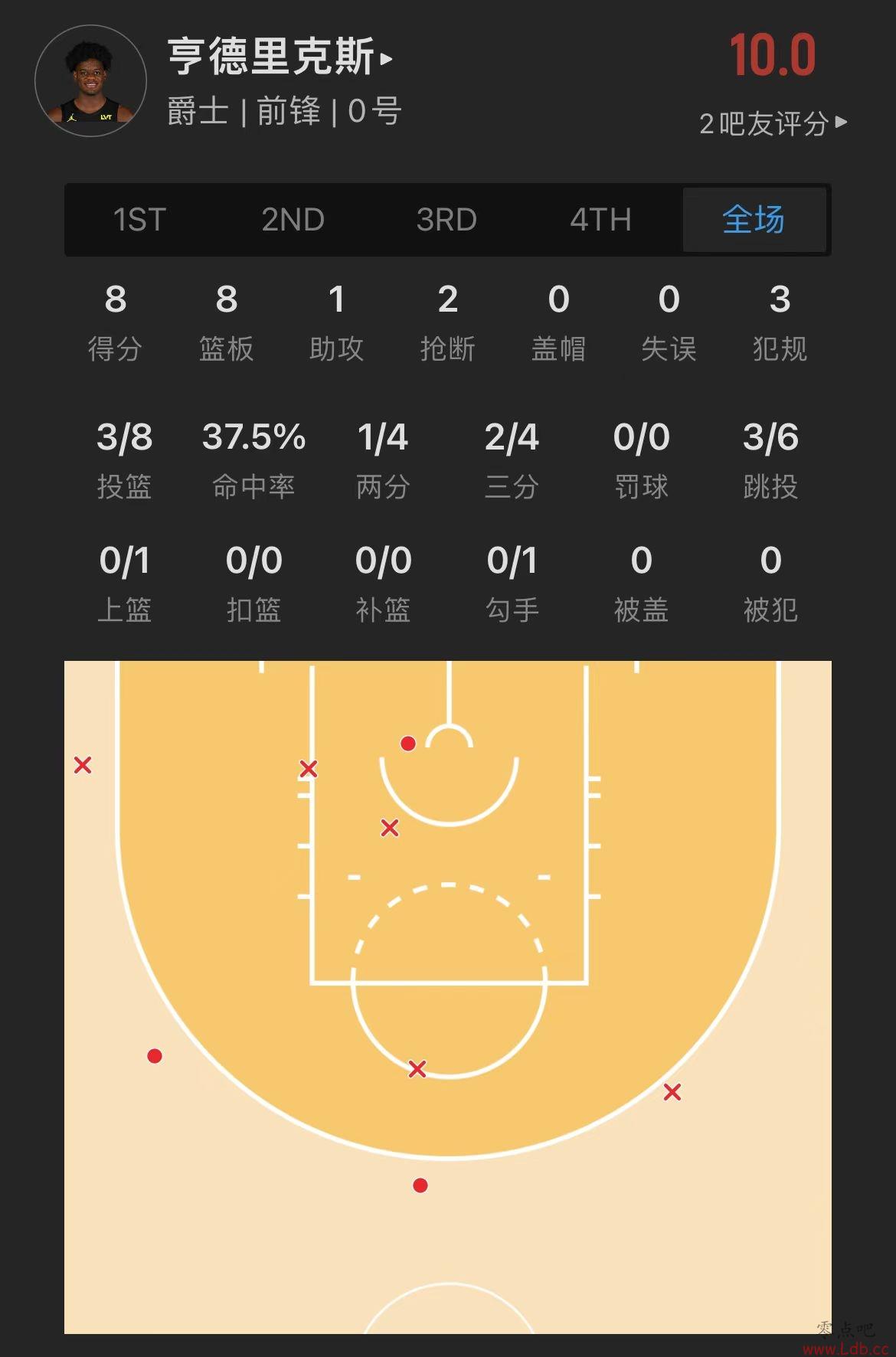 爵士9号秀 泰勒-亨德里克斯 出战27.0分钟