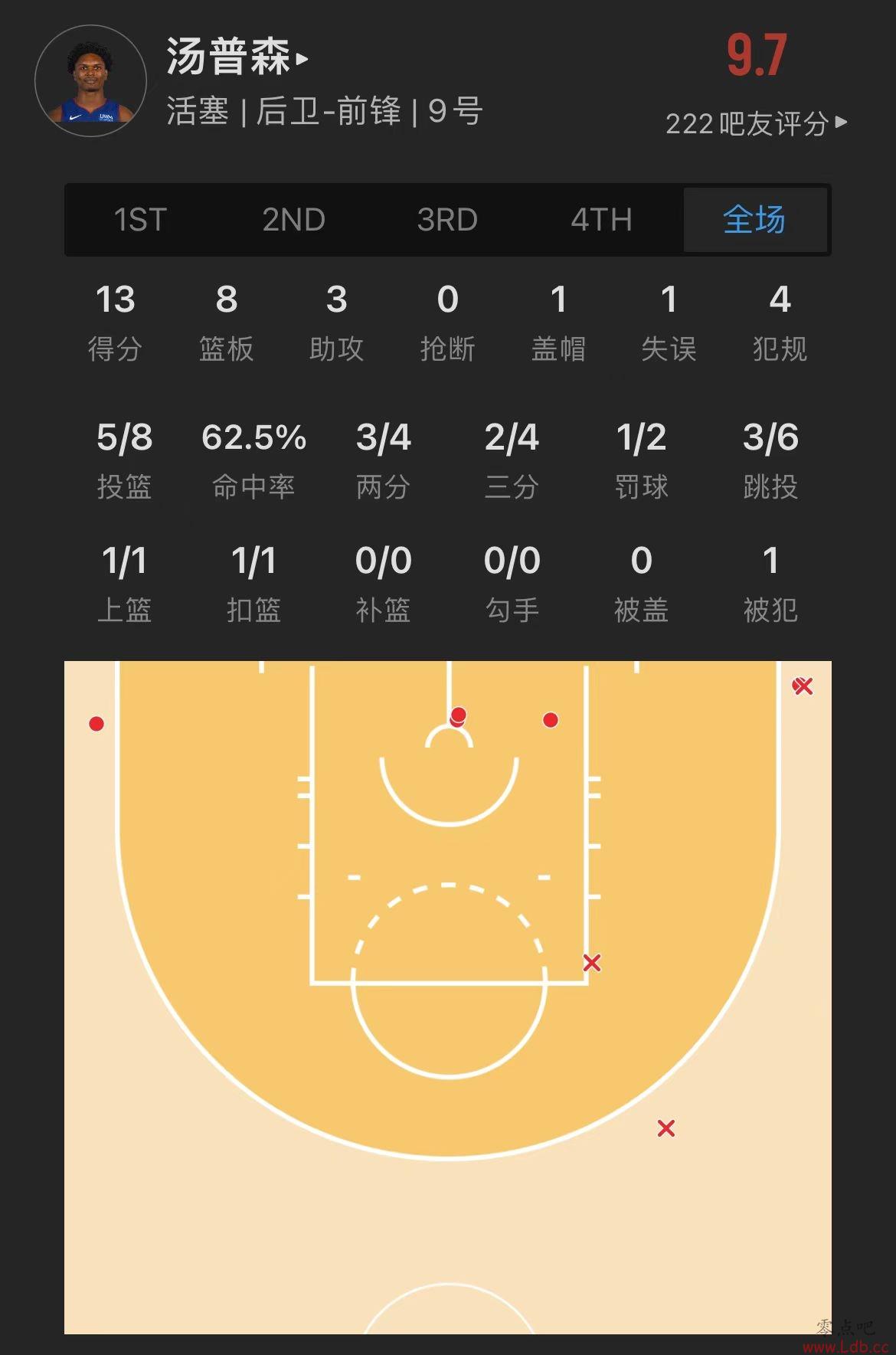 活塞5号秀 奥萨尔-汤普森 出战35.0分钟