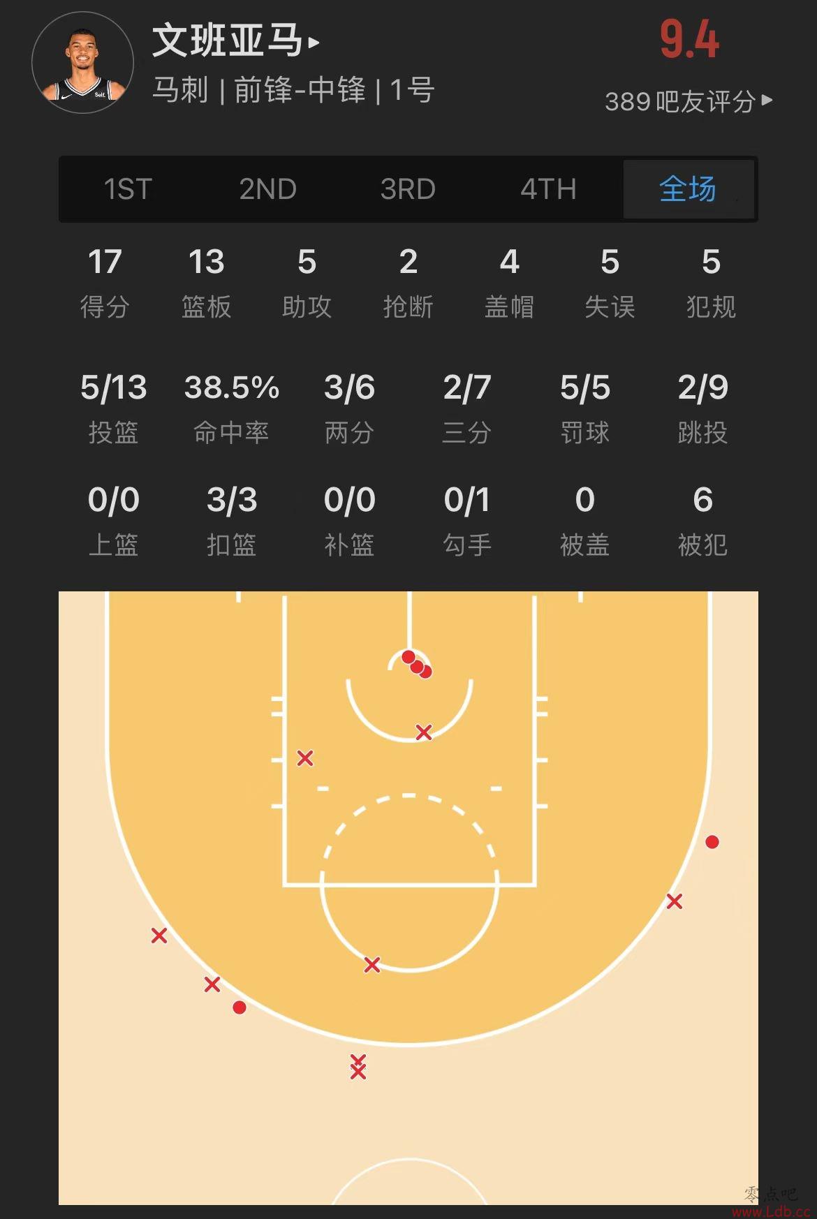 马刺状元秀 维克托-文班亚马 出战34.3分钟
