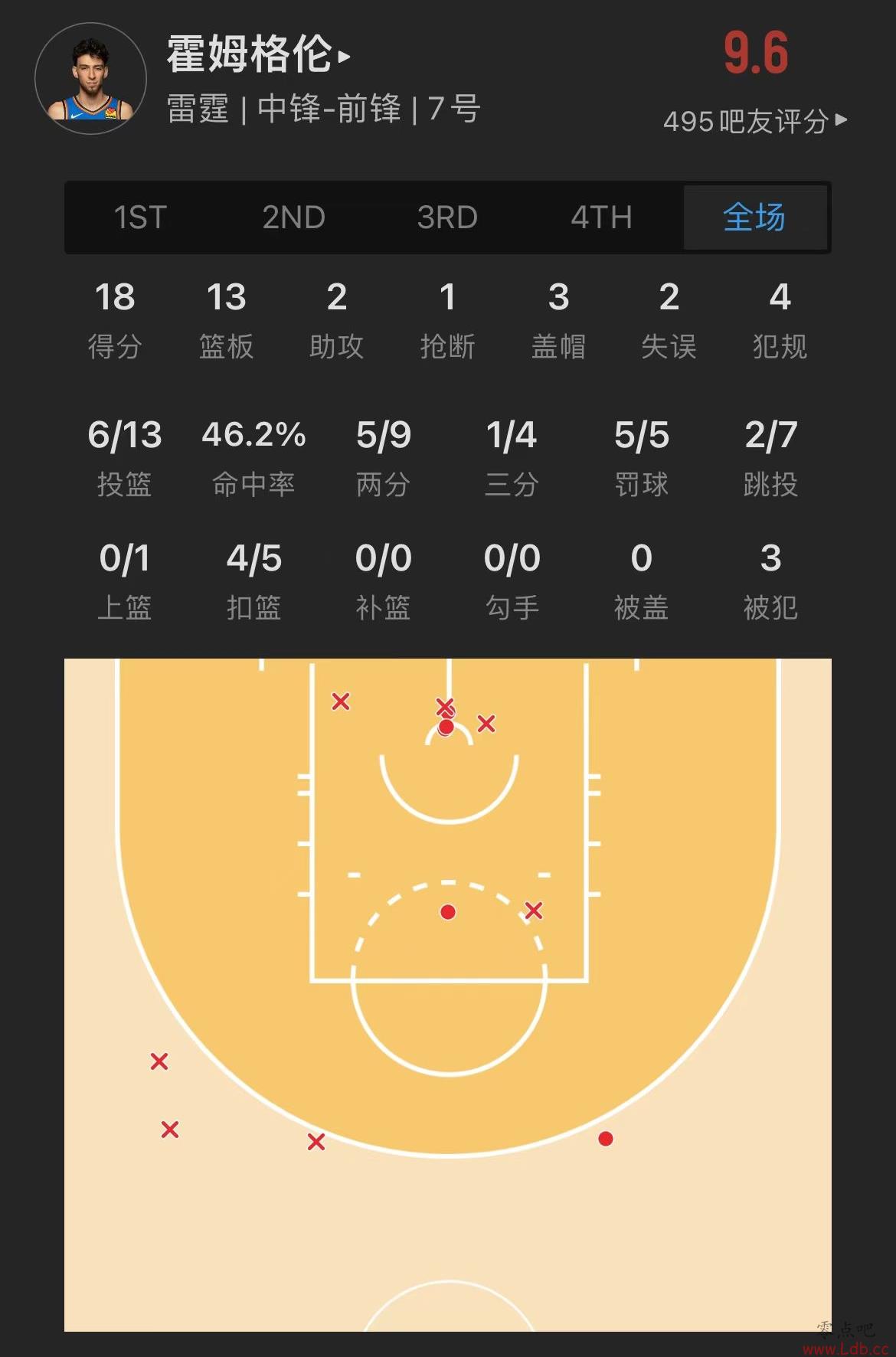 雷霆上届榜眼秀 切特-霍姆格伦 出战33.6分钟