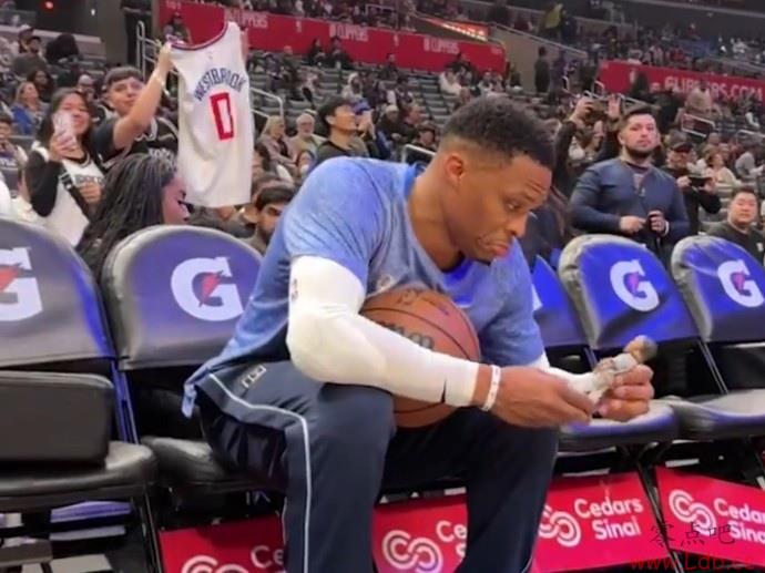 赛前,威少坐在替补席认真把玩自己的玩偶,十分有趣!