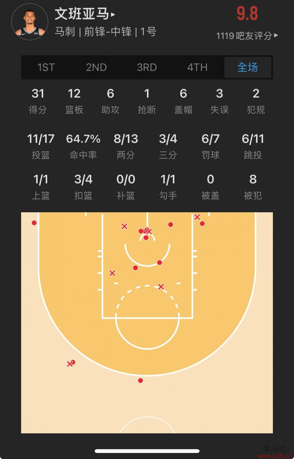 马刺状元秀 维克托-文班亚马 出战31.4分钟