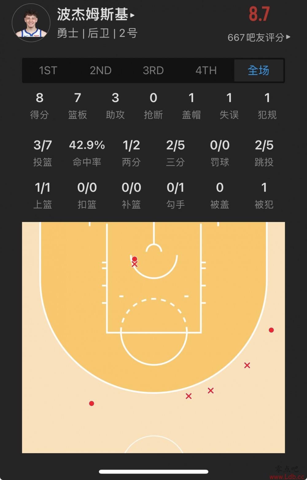 勇士19号秀 布兰丁-波杰姆斯基 出战26.3分钟