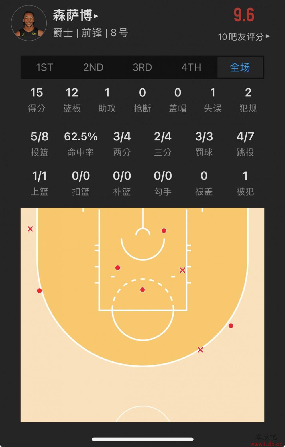 爵士28号秀 布莱斯-森萨博 出战29.7分钟