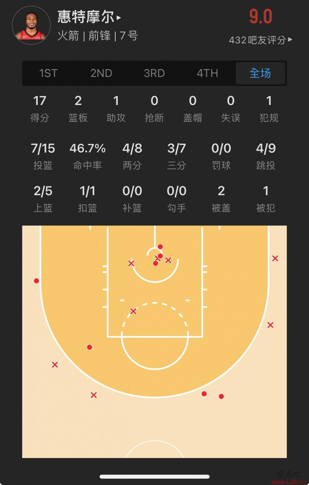 火箭20号秀 卡姆-惠特摩尔 出战23.7分钟