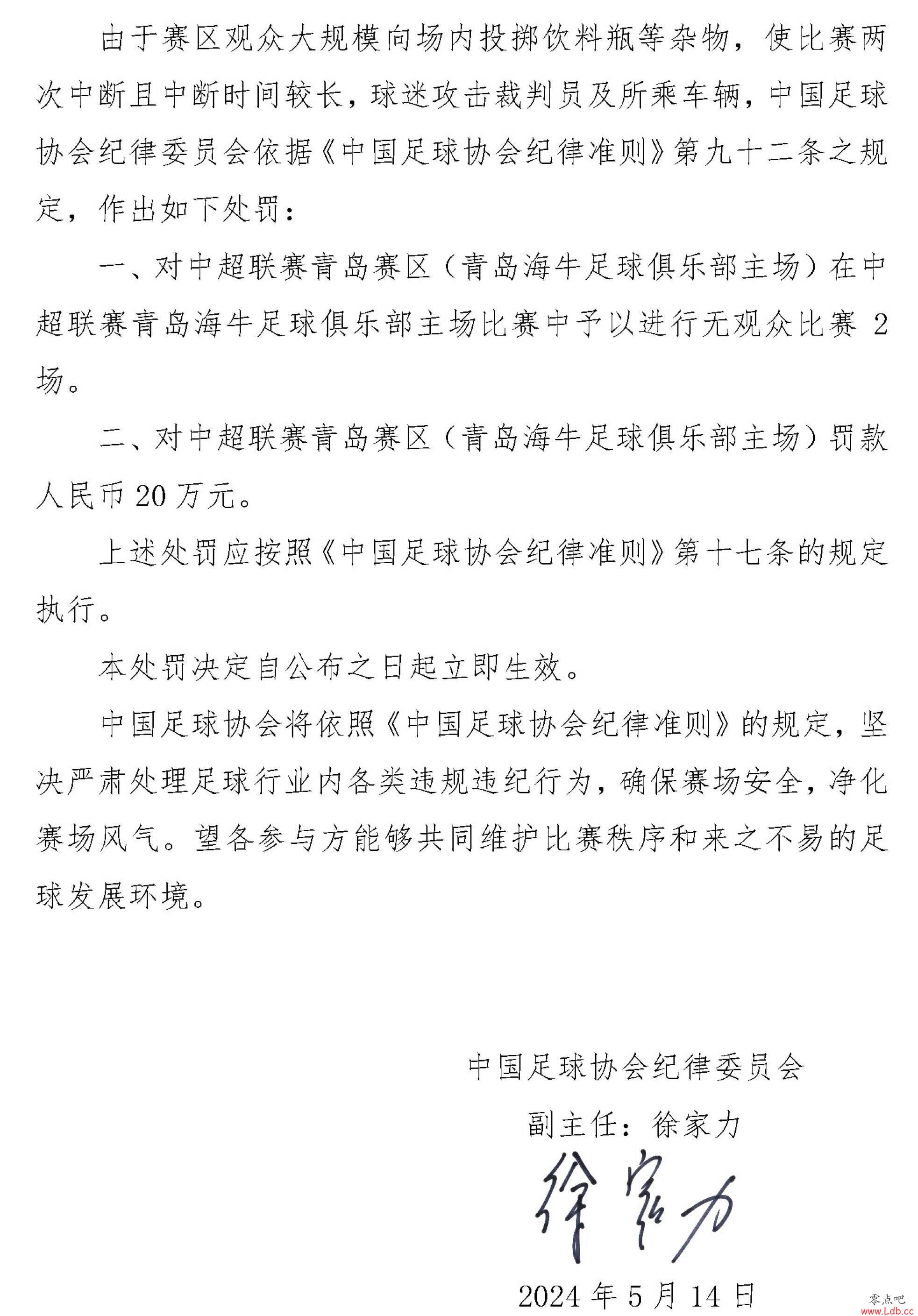 5月14日,足协官方发布公告,由于观众大规模向场内投掷饮料瓶等杂物,对青岛海牛处以主场空场2场,罚款20万元的处罚。