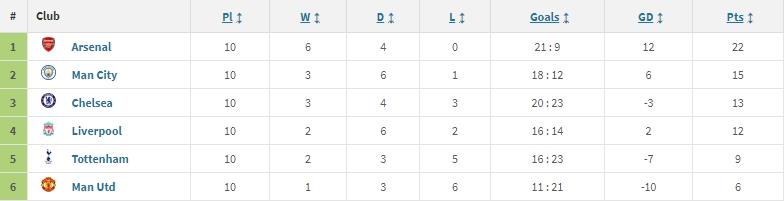 本赛季英超BIG6直接对话积分: