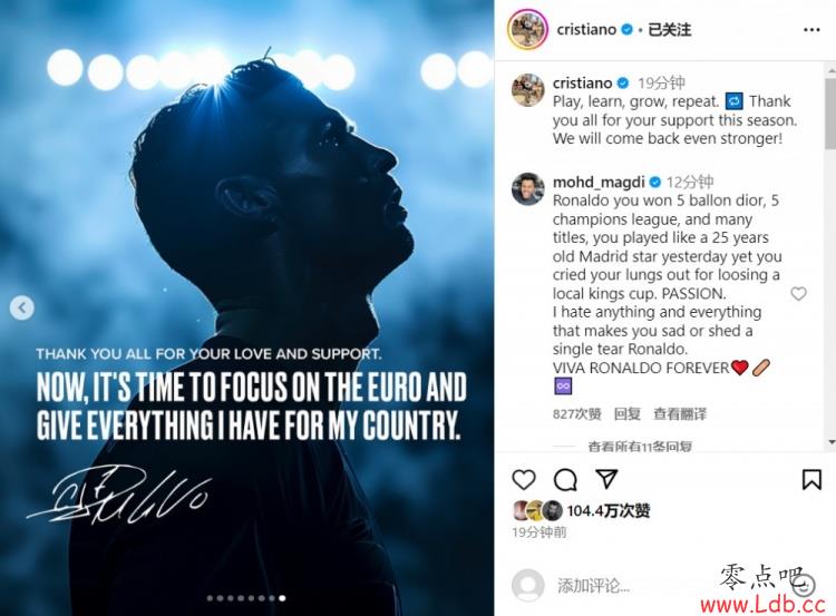 C罗:踢球、学习、成长、重复。感谢大家本赛季的支持。我们会更加强大地回来!