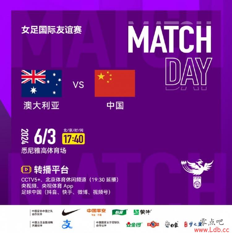6月3日17:40,中国女足将在悉尼与澳大利亚女足进行第二场国际足球友谊赛。此前,在阿德莱德进行的首场比赛中,两队1:1战平。CCTV5+、北京体育休闲频道(19:30延播)、央视频、央视体育App、足球中国(抖音、快手、微博、视频号)将对这场比赛进行直播,一起为女足姑娘们加油! ???