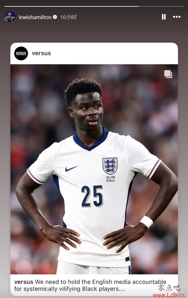 F1英国车手汉密尔顿也转发了一篇帖子,以此声援萨卡,并且呼吁英国媒体不要再系统性地诋毁黑人球员。帖子中写道: