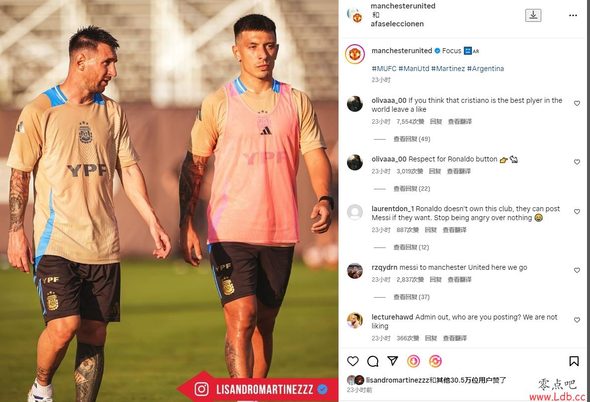 零点吧足球06月09日讯 曼联在官方社媒中分享利马在阿根廷的照片,但评论区为梅西出现在照片中而争论。